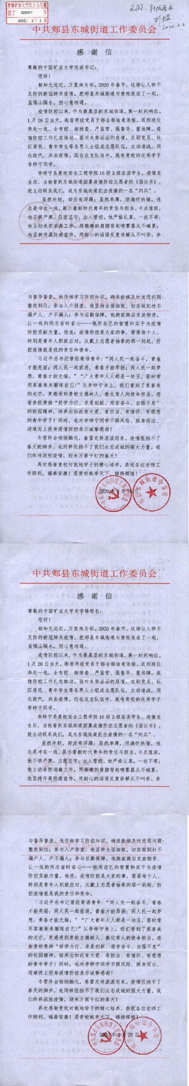 信中写道:疫情发生后,李梓宁同学看到东城街道招募疫情防控志愿者的《倡议书》,主动联系工作委员会,成为东城街道抗击疫情的一名“列兵”。他总是冲在一线,展示着新时代靑年的责任与担当。卡点值班,他不惧严寒,日夜坚守:出入管控,他严格认真,一丝不苟;他主动承担消毒工作,坚持开展防疫宣传,用耐心的话语反复讲解却从不叫苦。他仔细学习防控知识,参与督导督查和后勤保障,跑前跑后发放物资, 让一线的同志省时省心……他用自己的智慧和实干为疫情防控贡献出自己的力量。