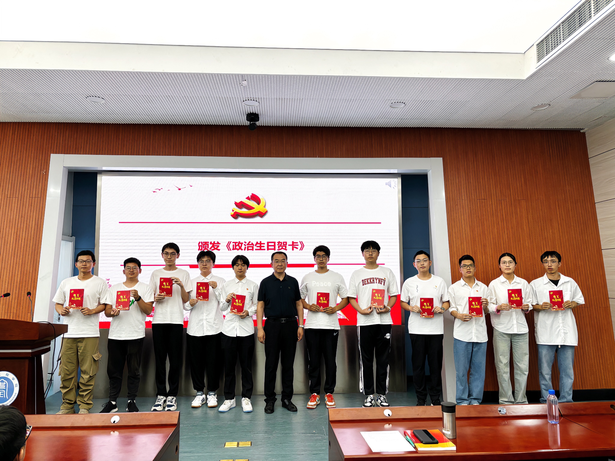 党课在激昂的国歌声中拉开帷幕。王恩元书记为新转正党员颁发《党员政治生日贺卡》,全体与会党员在党员代表俞嘉濠的带领下高举右拳、面对党旗,进行新党员入党宣誓和老党员重温入党誓词仪式。