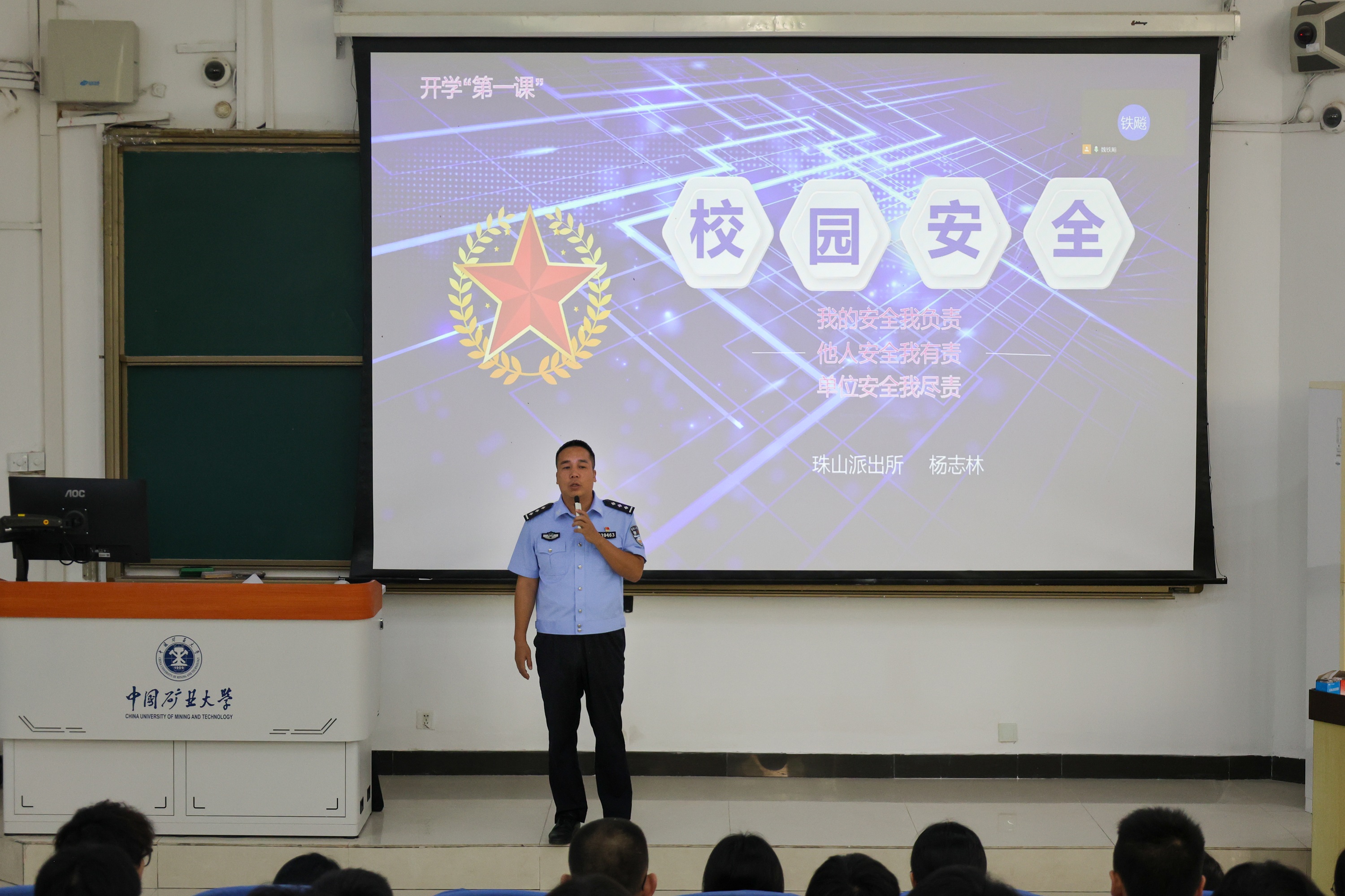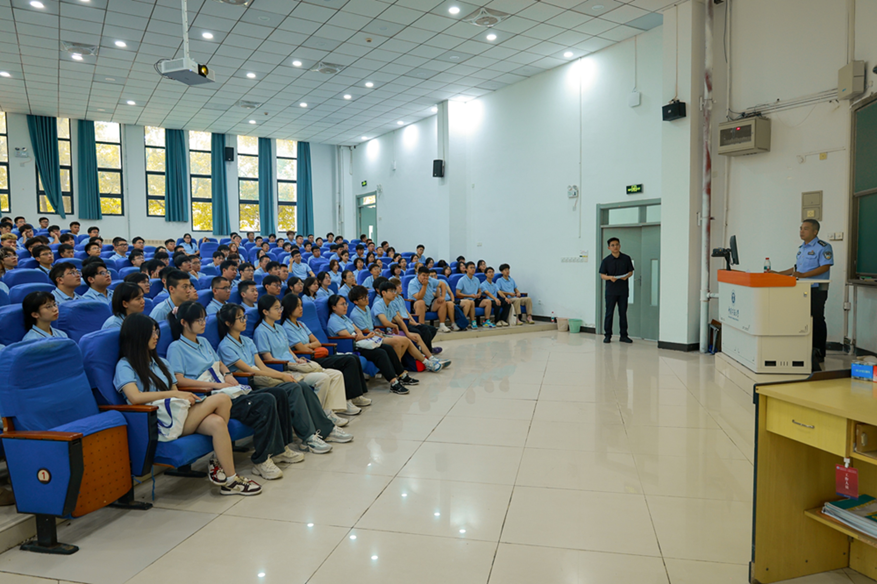 于博学楼2号楼C102教室举行校园安全专题讲座,特邀珠山派出所警官杨志林作为主讲嘉宾。学工办主任刘世通、2025级专职辅导员魏铁飚以及2025级全体本科新生、研究生线上线下共同参加。