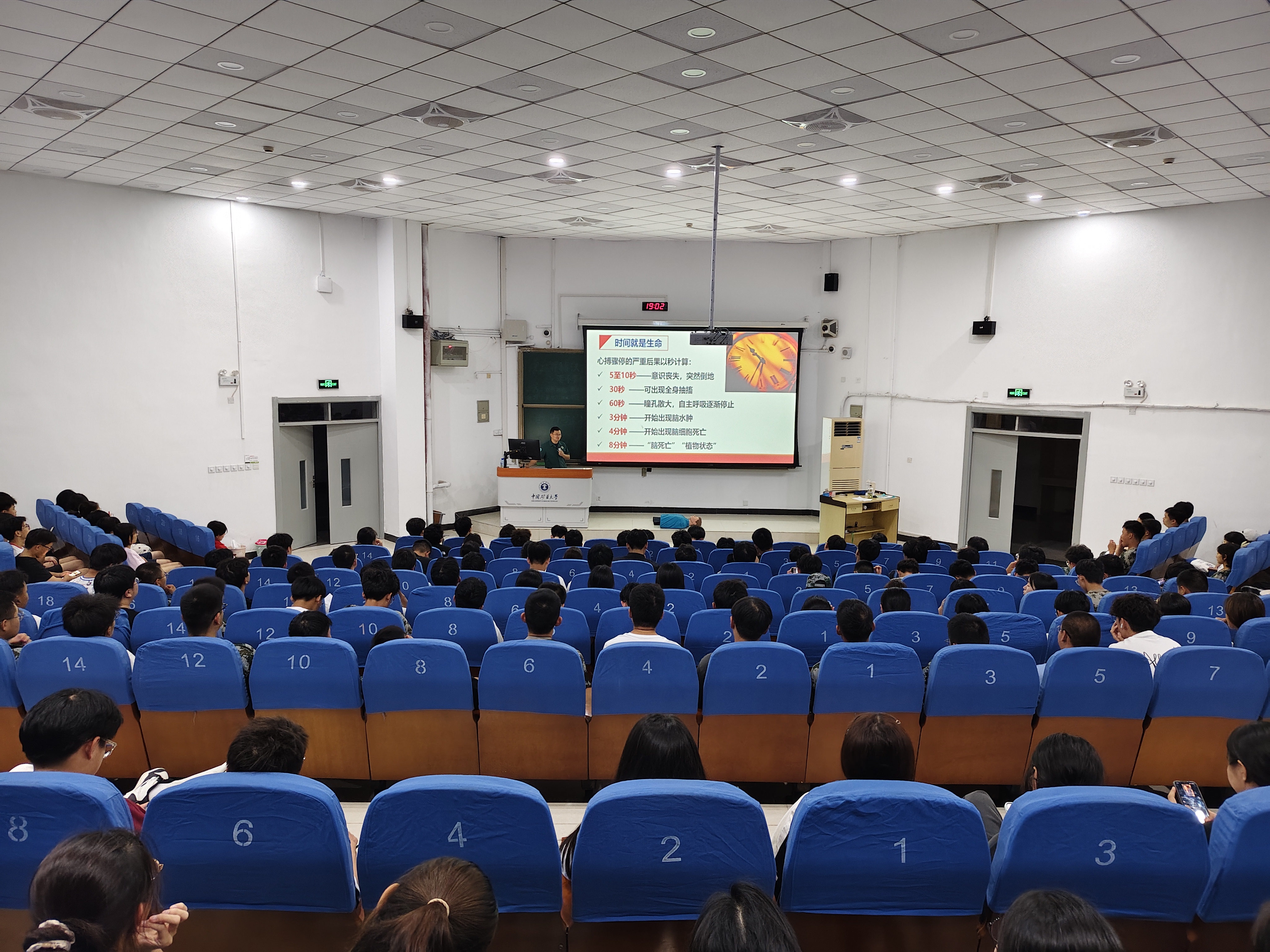 尹祥广老师首先通过剖析心脏骤停后黄金5-8分钟内不及时施救的严重后果,深刻阐释了掌握心肺复苏(CPR)等急救技能的必要性与紧迫性,并系统、详细讲解了心肺复苏的操作流程和与核心步骤要点。理论讲解后,徐州医科大学的志愿者现场进行了标准化的CPR操作示范,并特别设置了实操环节,组织学生分组进行模拟演练,在专业指导下亲身体验急救操作,强化对急救知识与技能的掌握。