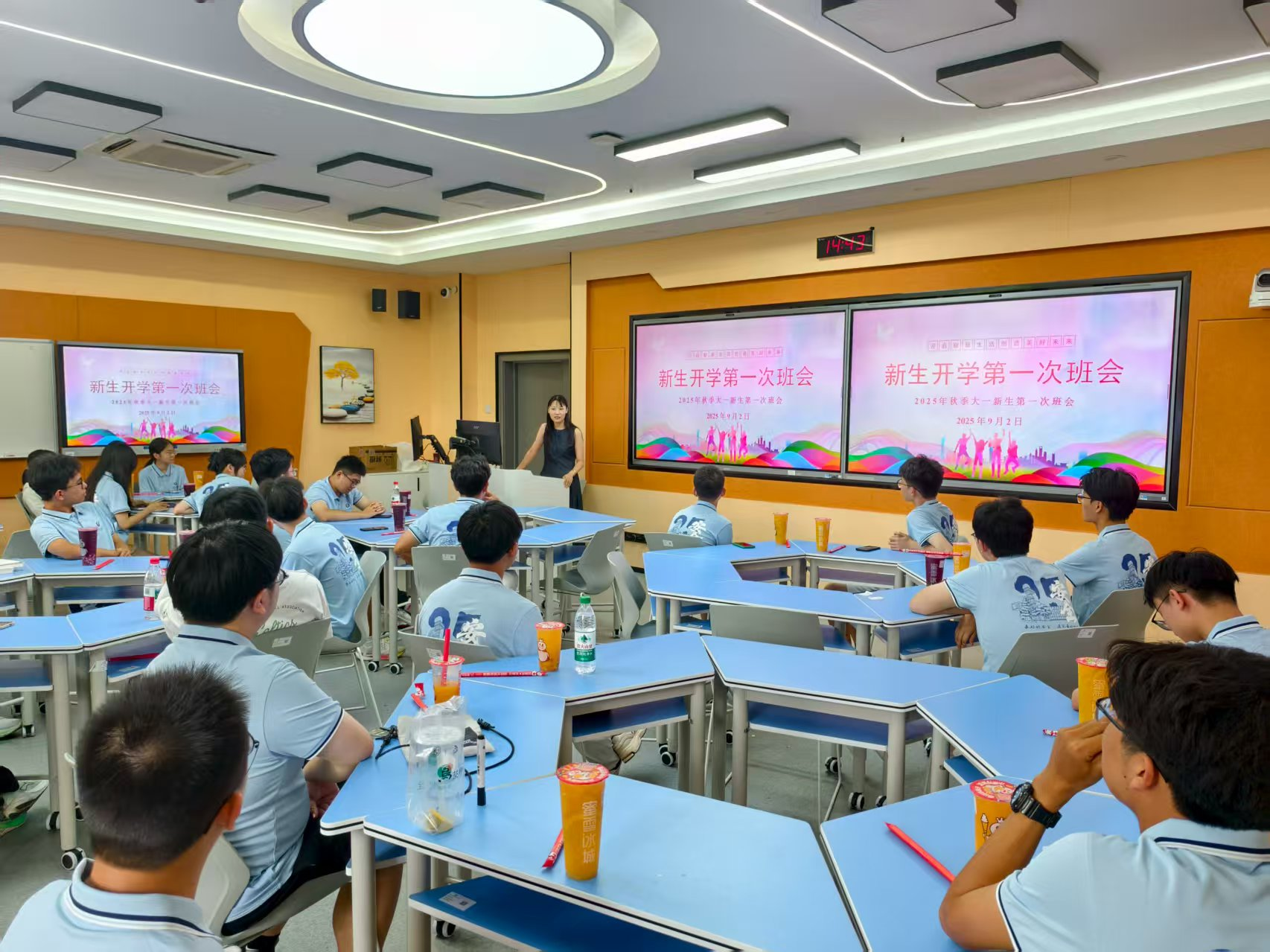 的学科特色、发展前景及人才培养目标,着重强调了大学阶段自主学习与独立思考能力的重要性,通过涉及专业课程体系、学习资源、校园生活服务等多方面的讲解,为新同学们清晰描绘了大学生活的整体图景。随后,同学们踊跃登台,分享个人兴趣、家乡特色及对大学生活的憧憬,或幽默风趣引发欢笑,或真诚朴实打动人心,现场气氛活跃热烈。