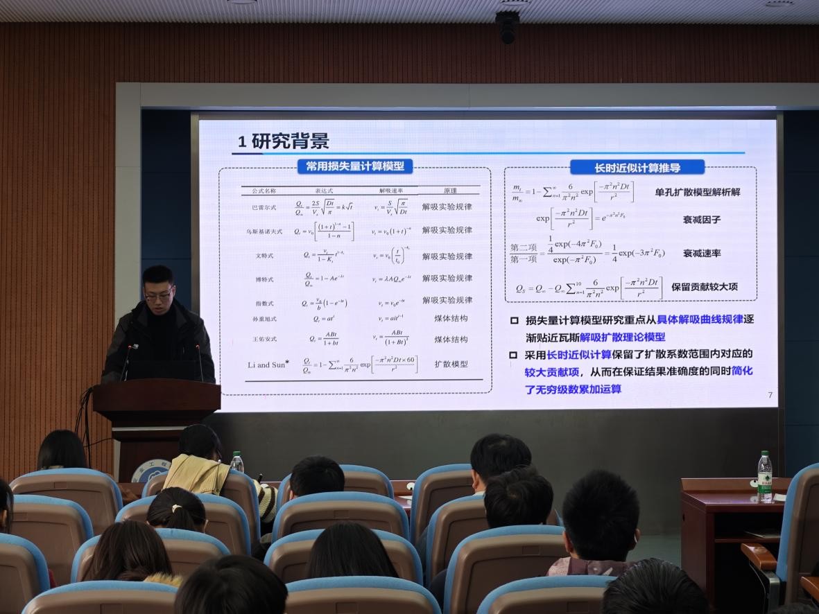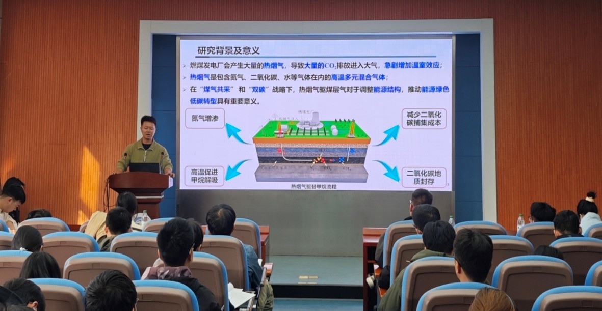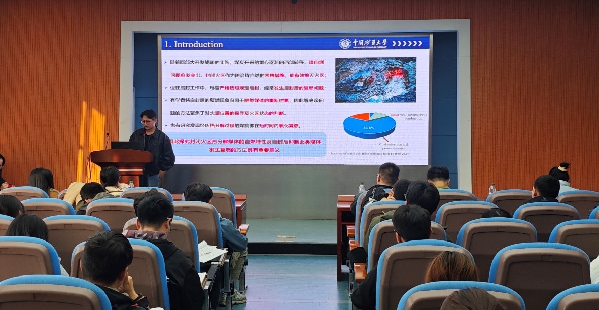 聚焦安全工程前沿领域,三位博士生分别作了专题报告。程忠武以《基于最优扩散系数的损失瓦斯量计算模型研究》为题,介绍了瓦斯灾害防治领域的模型创新与工程应用;黄静汇报了《高温烟气注入强化深部煤层纳米限域甲烷开采的分子模拟研究》,从微观机制层面探讨了煤层气高效开采的新途径;汪洋围绕《封闭火区热分解煤体活性位点的产生及受控氧化实验研究》,分享了煤自燃防治方面的实验进展与工程启示。主讲人还结合自身科研经历,就选题策略、研究实施与论文写作等话题与现场同学进行了深入交流。