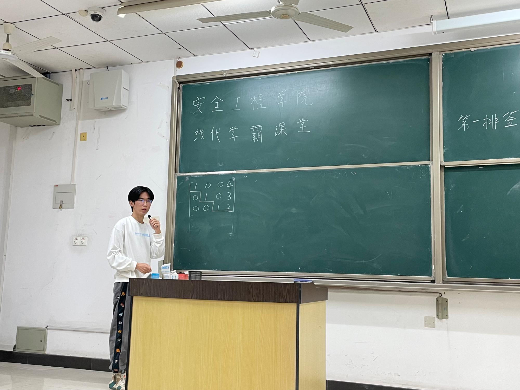 首先,俞嘉濠以线性代数模考试卷为依托,分析了知识体系中的重点与难点。接着,他按照试题顺序为同学们扫清知识盲区。讲解过程中,俞嘉濠为大家提供自己的解题思路,将书本上的知识点与题目结合,从而使同学们对试题的理解更加清晰、透彻。他将题目化繁为简,并在黑板上写下重要解题步骤,帮助同学们构建起扎实的知识体系。活动最后,俞嘉濠为大家提供了存有线性代数笔记的个人账号,希望同学们各取所需并且在考试中厚积薄发,得到一个理想的成绩。