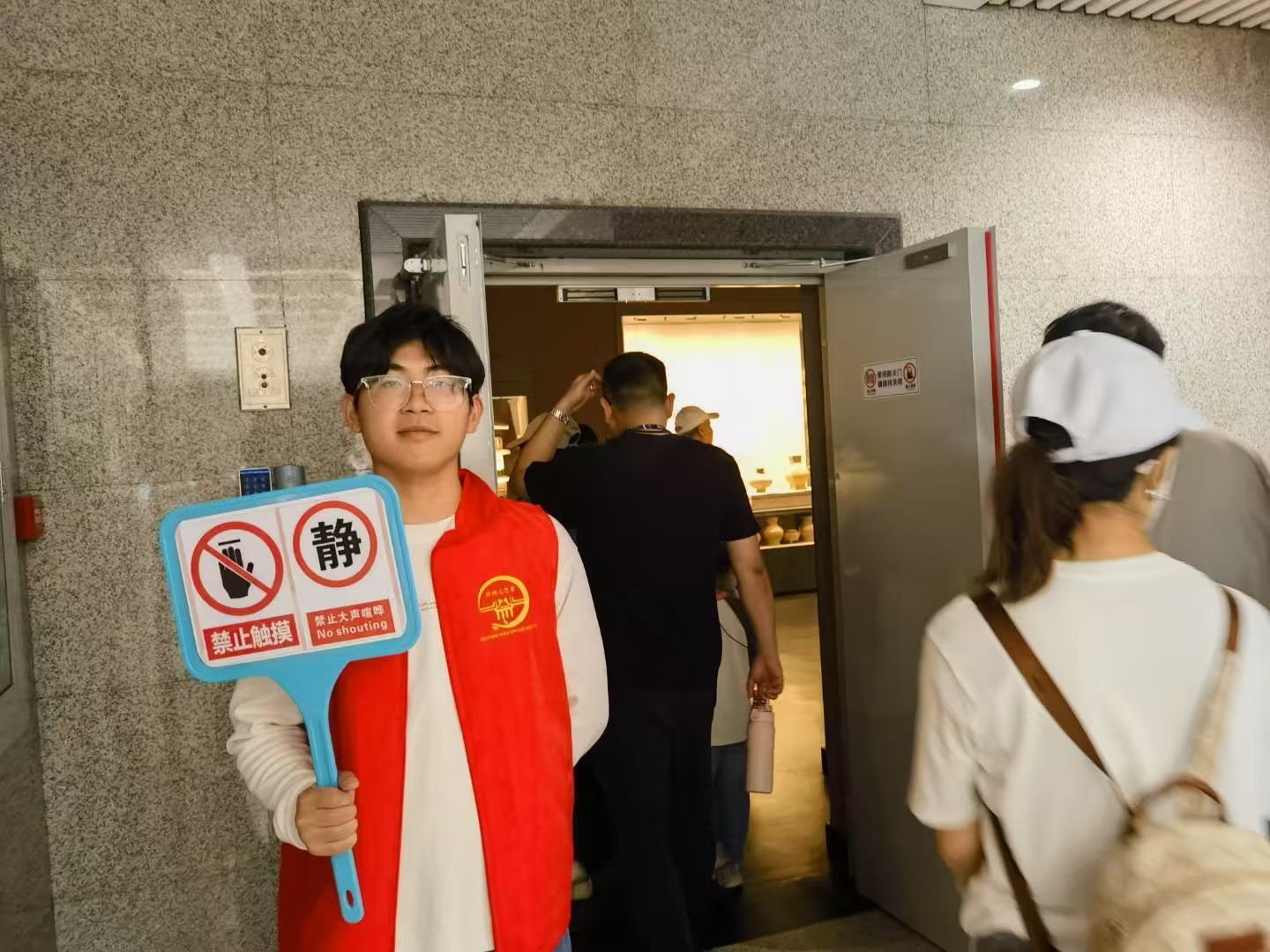 的志愿者们提前到岗,迅速投入工作。尽管参观者络绎不绝,工作强度较大,志愿者们始终坚守岗位,以饱满的热情、专业的素养和真诚的态度服务每一位游客。他们不辞辛劳,耐心指引路线、解答疑问,用行动保障了游客良好的参观体验,成为博物馆内一道亮丽的“志愿红”风景线。