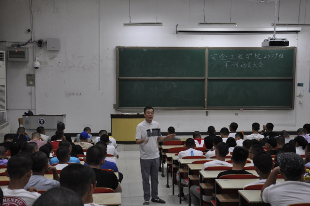 首先,于基伯老师简单总结了这几天新生入学教育的成果,并对同学们的表现表示肯定。其次,于老师从服从管理、军队情怀、培养品格三方面阐述了军训的必要性,并从安全学科的特点切入,号召同学们在军训中培养服从意识、家国情怀以及坚韧的品格,今后要为安全学科的发展贡献自己的力量。之后,19级新生从军校退学考上矿大的王德清同学为大家讲述了他自己在军校军训的趣事和军训带给他的深刻记忆,并勉励同学们克服困难,战胜自我。最后,于基伯老师分配布置了军训期间的各项任务,介绍了军训内务的要求标准,动员大会结束。