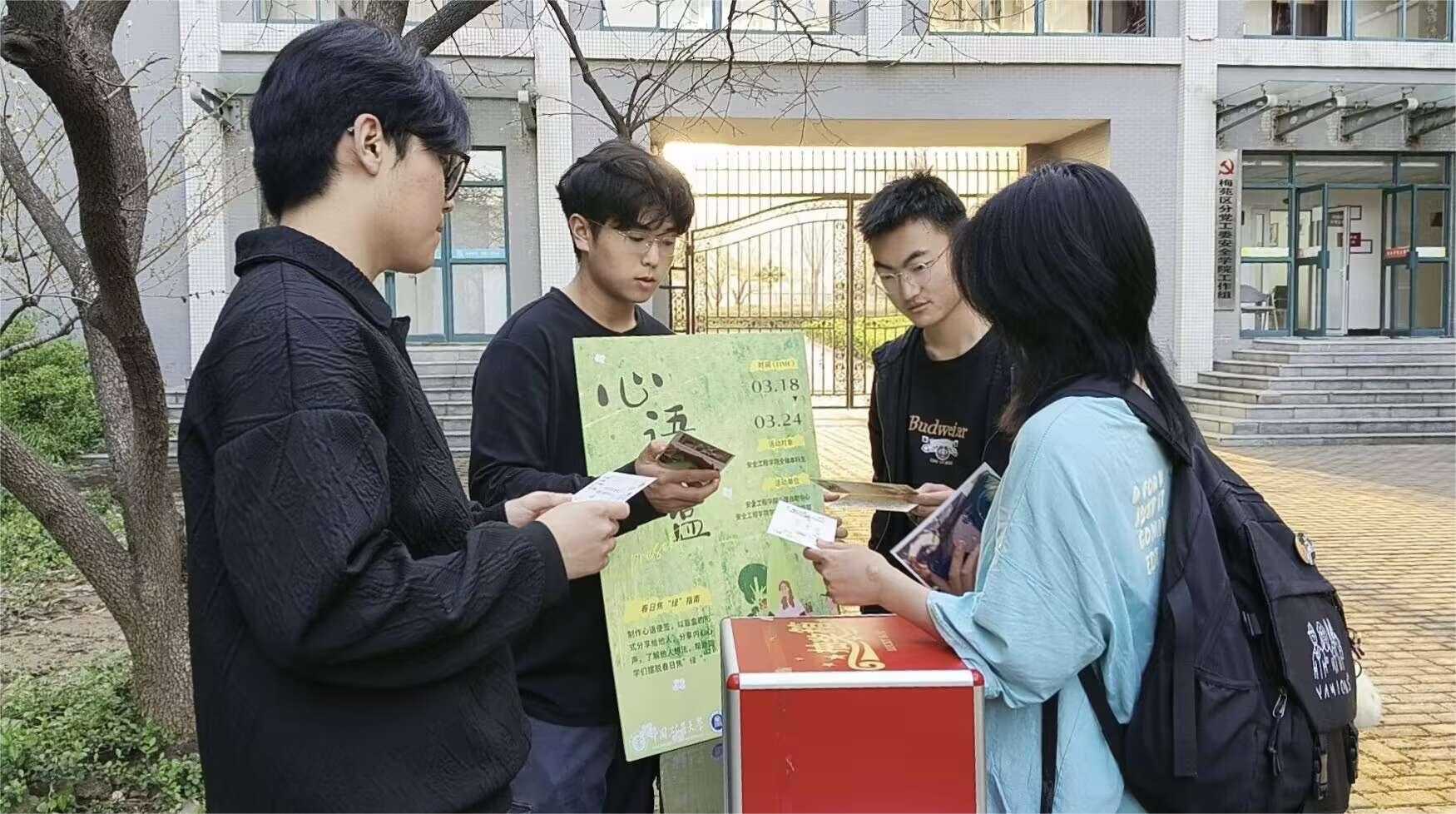 活动前期,同学们领取到主办部门提前准备好的空白明信片,写下安慰和鼓励的暖心话语,绘画上装饰的图案,精心地制作好心语便签,并投入盲盒中。活动中期,同学们来到梅三天井,写下自己的焦虑或烦恼,并从盲盒中抽取一张便签作为回应。同学们通过盲盒交换的形式,在了解他人想法的同时,也将内心的心声分享给他人,互相激励和成长,共同克服内心的负面情绪。活动后期,主办部门对参与者的作品进行评比,并设立奖项,分发奖励,以鼓励同学们更勇敢地直面内心的情绪。