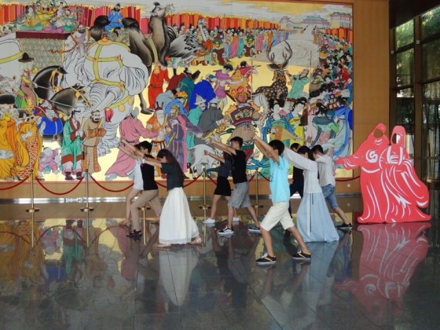 早晨八点,,实践团成员到达了西安大明宫国家遗址公园,经过了一番有序的排练后,戏曲广播体操表演正式开始。除了参与表演的成员外,其余小组成员进行拍摄,并对周边游客进行讲解、宣传,呼吁他们参与进来,进行亲身体验,享受我国传统文化所带来的无限乐趣。表演结束后,对参与活动的民众进行采访,谈谈对此次活动的感受,并赠送小礼品。尽管气温越来越高,但实践团成员依旧认真的争取把每一个动作做到整齐标准。下午二点,实践团成员到达了西安大唐芙蓉园,在上午表演的基础上进行调整,选择场地进行戏曲广播体操的表演。在一次次的表演后,表演成员的齐心协力、动作整齐划一,取得了极好的表演效果。