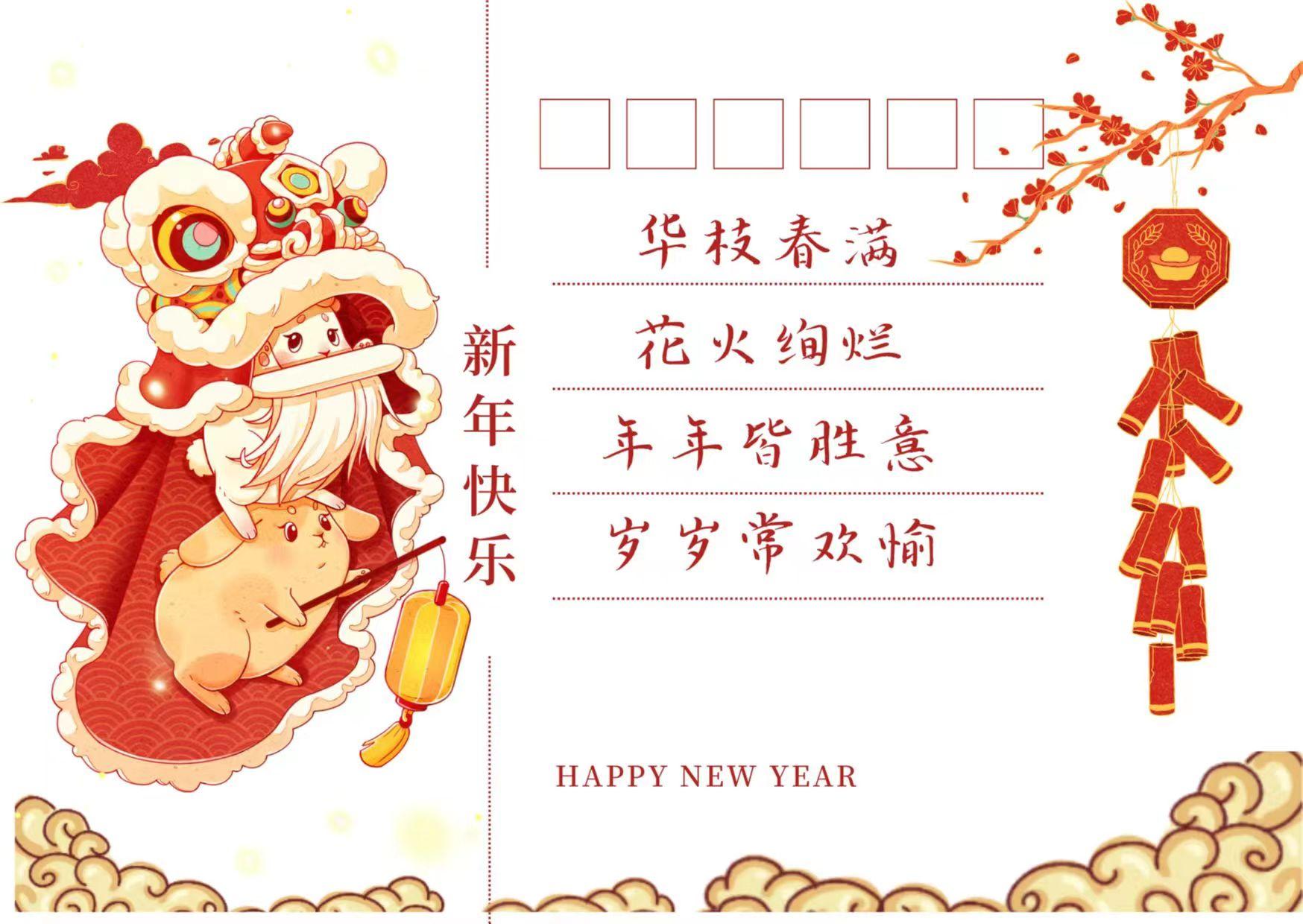 活动前期,通过团委学生会公众号进行线上宣传,迅速引起了同学们对活动的兴趣。同学们积极报名,通过手绘或明信片创作软件设计自己的新年贺卡。在贺卡的正面,同学们手绘上图案,运用瑞兔、灯笼、对联、鞭炮、烟花等元素,充分彰显出春节的喜庆气氛。在贺卡的反面,同学们写上了对新年、对家人、对自己想说的话,真挚的话语流露出大家对新的一年的美好祝愿和期望。作品收集完成后,由主办方评选出优秀作品,进行线上展出,供大家欣赏。