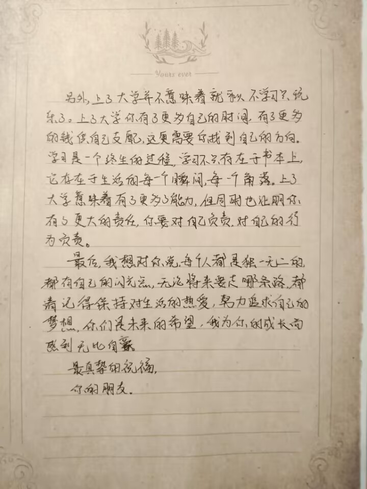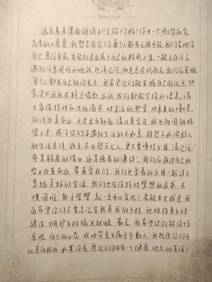 在此活动期间,同学们踊跃参加,认真书写对乡村孩子的祝福。同学们以文字为寄托,以真心触动真心,将拥抱通过信件的方式传递,温暖这群孩子们的心灵。同学们通过笔下的文字,在孩子们心中营造出美好的花园,焕发起乡村孩子们对知识的渴望,助力他们更好地走向光明的未来。同学们写的每一封信都如阳光一般温暖,为他们的成长增添一抹色彩。