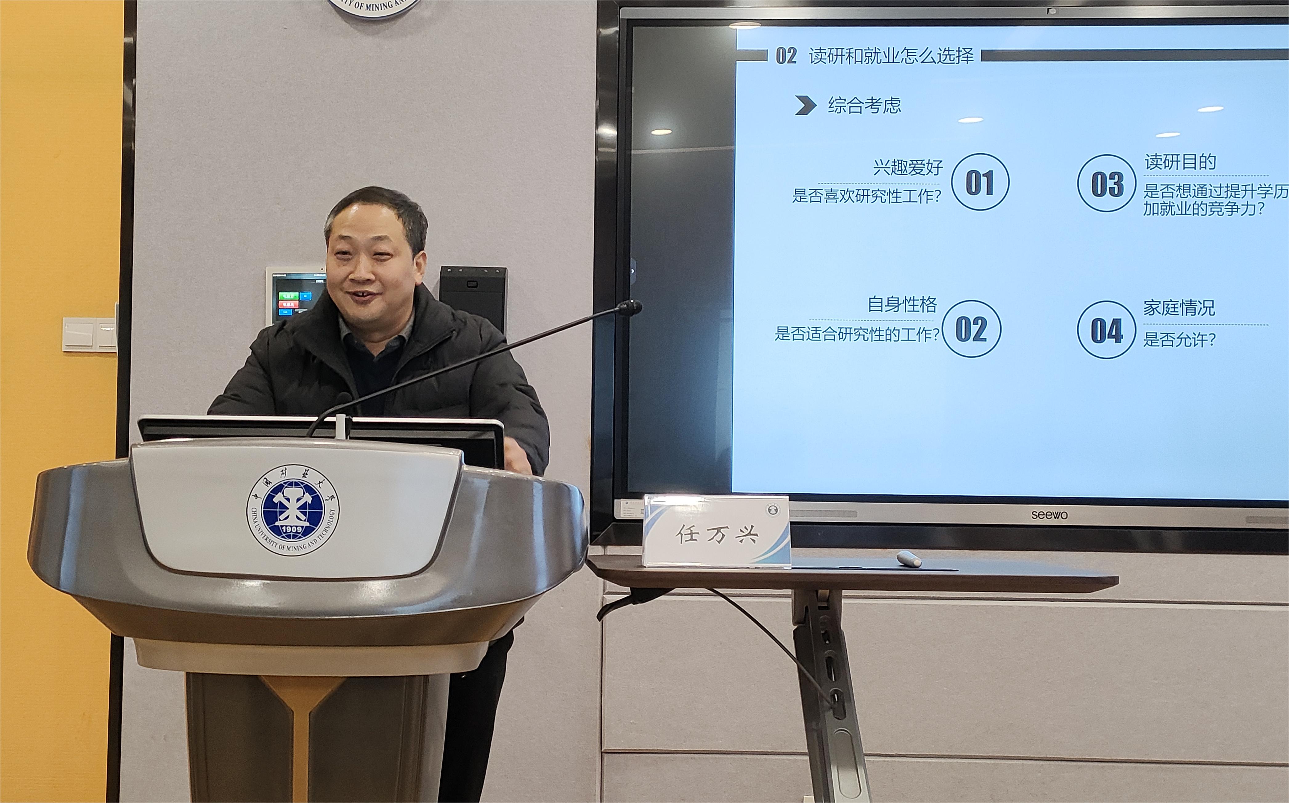 首先,任老师从“本科阶段的重要性”入手,他指出,本科阶段是一个人的成长和发展关键时期,学生应该对自己的兴趣、优缺点、价值观和目标要有清晰的认知。接着,面对读研和就业的选择问题,他告诫同学们要认真思考并权衡个人兴趣、职业规划、学科难度、自身性格、家庭情况等等多方面因素,做出更明智的选择。之后,任老师还分享自己的求学经历中有趣的故事,强调培养良好的习惯对于未来成就有着至关重要的作用,也鼓励同学们培养兴趣爱好、积极锻炼身体、保持良好的学习和生活习惯。此外,“扬长避短,彰显特色”也是任老师为学生提出的重要建议之一。他指出每个人都有长处和短处,并鼓励同学们发现自己的优势,突显个性特色,正视自己的短处,尝试找出原因并加以改善,以便在竞争激烈的就业市场中脱颖而出。最后,任老师结合自己的求学经历和生涯规划经验,耐心解答了同学们的疑虑。他还强调每个人都有一条属于自己的路,希望同学们在追求自己的人生目标的过程中,不受他人干扰,坚定走自己的路。