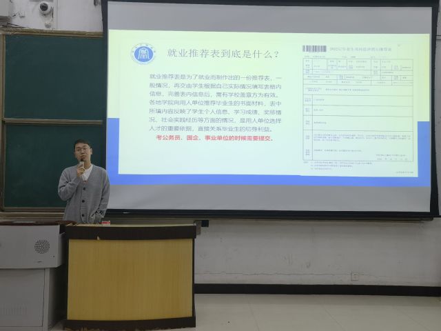 大会伊始,孙一伟老师提醒各位同学完成心理健康的测试,接着介绍了就业推荐表的用处及其重要性。同时,从三方协议和同学们寻找日常就业信息、就业办事流程三个方面介绍了大学生就业的具体事宜。大会邀请了21届优秀研究生分享考研经验和考研的具体事项,针对同学们的疑惑做出解答并给出建议。随后,成功与公司签约的尚玉龙和金花同学也分享了自己的感想,简单介绍了自己的签约公司,给出就业建议。最后,刘世通老师对面临就业、考研等多项选择的大四全体学生进行了心理辅导,引导学生根据自身具体情况做出最好的判断,校内秋招岗位多,春招时岗位都趋于饱和,需求量少,竞争压力大,建议同学们抓住秋招的好机会。最后在企业对毕业生的能力要求、学习成绩、薪酬待遇等方面做了分析。