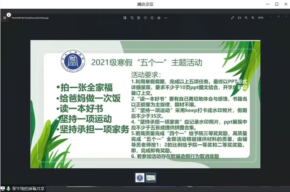 本次活动中的“五个一”具体是指:在寒假期间,拍一张全家福,给父母做一顿饭,读一本好书,坚持一项运动与坚持承担一项家务。开学当天,同学们纷纷将自己的寒假生活以PPT的形式呈现并上交。有的同学在寒假读完了一本好书,有的同学在寒假学会了一道拿手的菜,还有的同学为坚持住一项运动而自豪。最后,在评委的审核下,按比例评选出最终获奖名单。