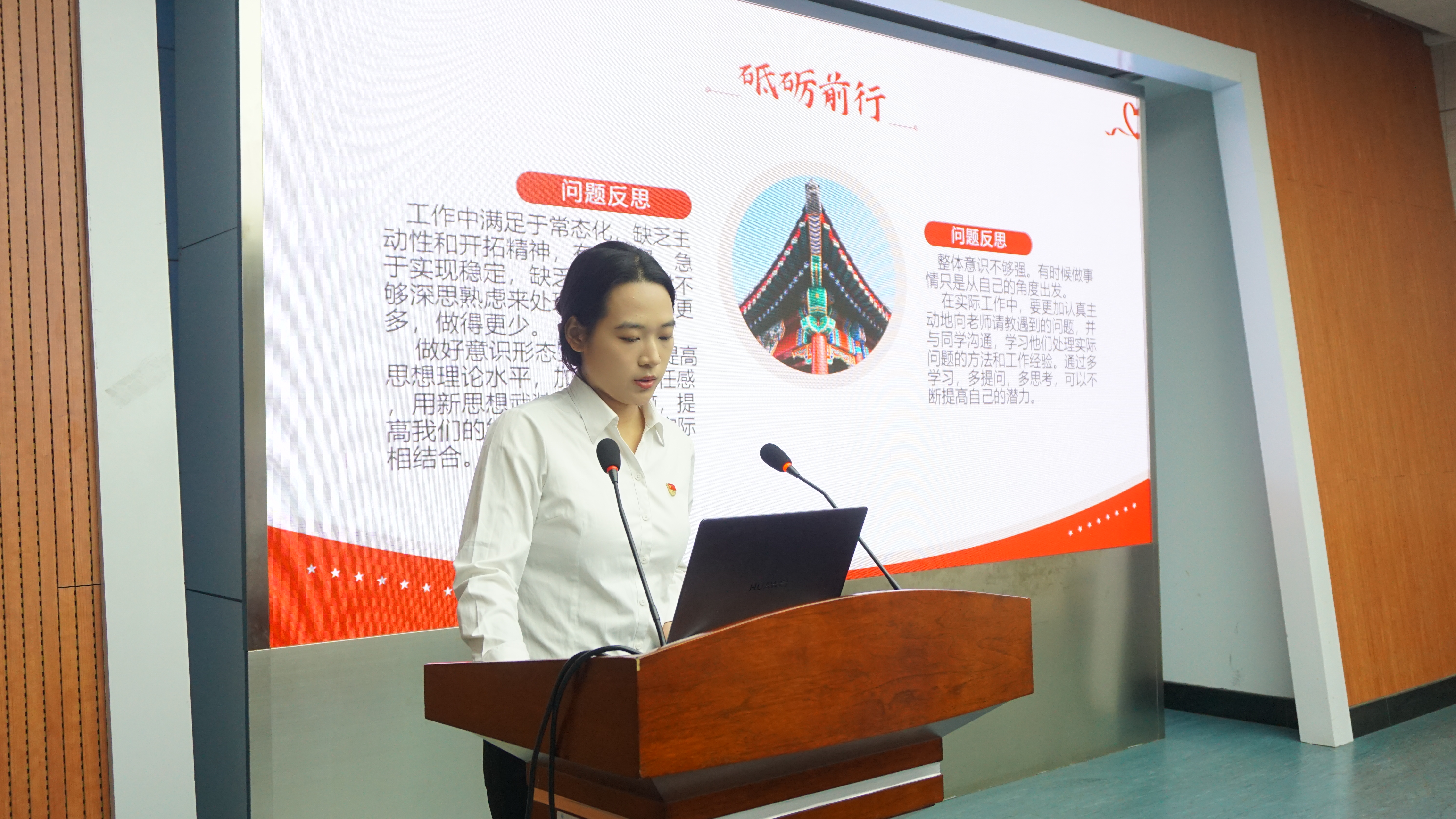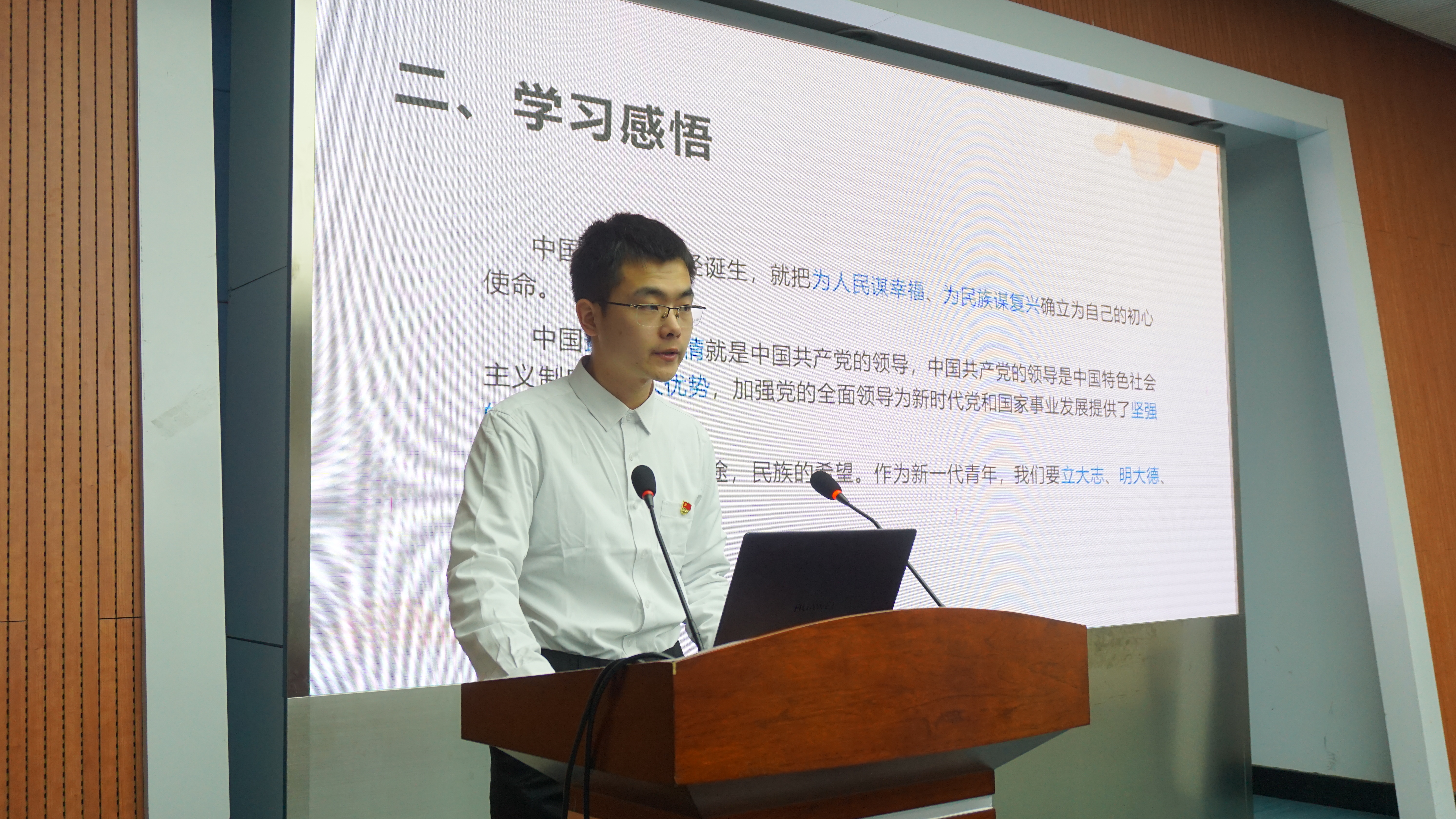 汇报结束后,刘世通老师强调每名党员都是一个旗帜,要坚持“两个确立”,增强“四个意识”;要志存高远,矢志报国;勤勉实干,追求卓越;要珍惜韶华,深耕行业,积极为社会主义事业奋斗。本科生第一党支部书记郭佳带领全体党员重温入党誓词,本科生第二党支部书记胥振激励各位学生党员始终牢记自己的党员身份,坚定理想信念,加强理论学习,不断提升党性修养,积极做好志愿服务工作,发挥榜样示范作用。