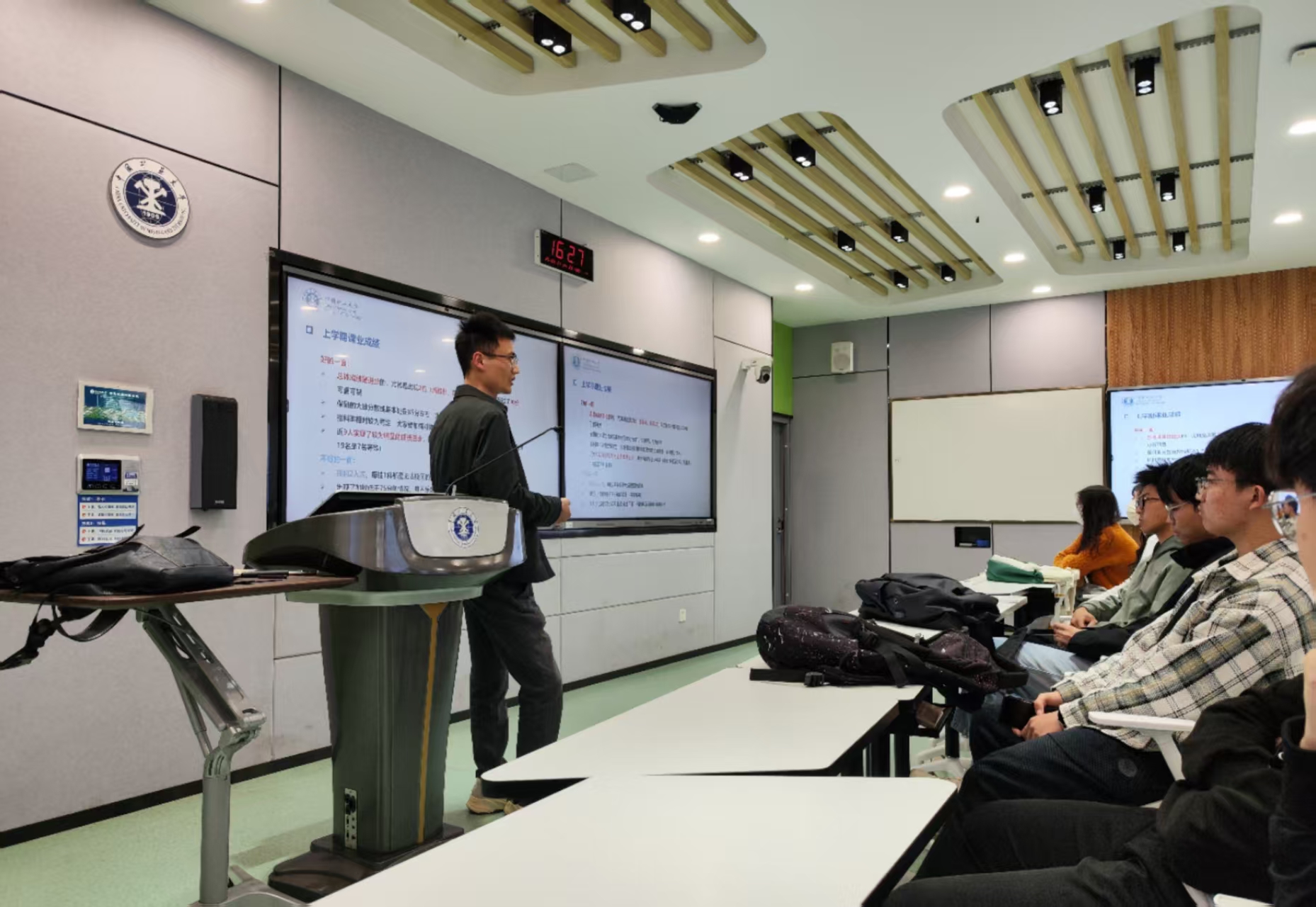 活动伊始,刘通老师就上个学期班级获得的集体荣誉做出了梳理和总结,包括校级爱心班级、院运会优秀班集体和校级优良学风班流动红旗等荣誉,并对大家上一学期以来的努力做出了肯定。随后,刘通老师为班级这学期设定了零挂科,高均分的总体目标,希望我们在学习上把握好细节,保持好的学习习惯,并强调了英语四六级的重要性,动员大家积极备考,提升班级整体的六级通过率。议程的最后,刘通老师给了全班每人一个纸条,让大家写下这一学期的目标,加强同学们自身目标感的同时加深了老师与学生之间的沟通,并对活动做了总结。