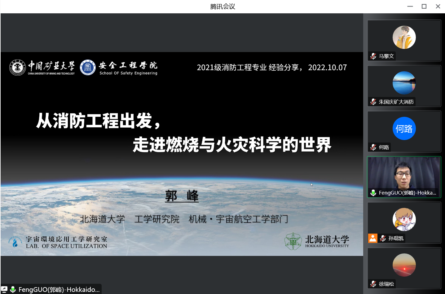 活动开始,郭峰博士依次介绍了自己在中国矿业大学本科和硕士阶段的求学经历、在北海道大学博士阶段进入燃烧科学的研究方向以及工作后在燃烧科学领域的研究课题,分析了博士后与本科硕士阶段的区别与联系,对同学们提出了四点建议:要学好本科阶段的基础课程,培养自己的兴趣爱好,结交志同道合的朋友,探索自己感兴趣的行业和领域。接着,郭博士解答了同学们提出的问题,提醒同学们要重视基础学科的学习,鼓励同学们要勇于尝试,摸索自己的兴趣方向,跳出舒适圈挑战自己,“每一次挑战一点点,生活就会有不一样的变化”。随后,朱国庆教授重点讲解了大一、大二阶段理论学习对未来发展和研究的重要性,“本科的基础课和专业课学好,科研的底气更足,未来天花板更高,同学们要珍惜当下,不虚度光阴,不要让新冠疫情影响大家的学习和科研”,同时鼓励同学们建立起学科自信和社会责任感,“城市火灾形势严峻,火的研究有迫切需求,需要大家认真琢磨和研究,希望大家不要脱离消防行业,消防需要大家共同攻坚克难”。最后,班主任何路老师勉励同学们要约束自己的行为、管理自己的时间、明确未来的道路,把握机会,为消防事业的发展做出贡献。