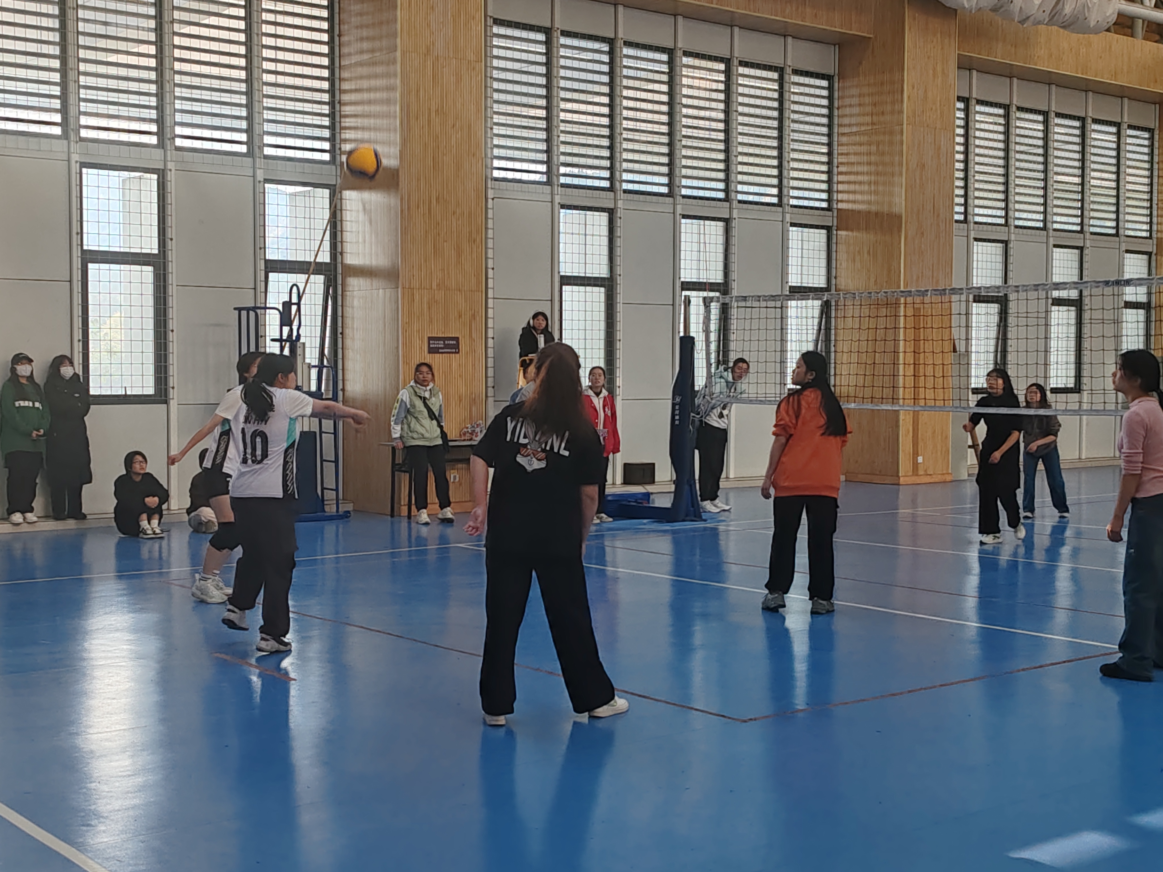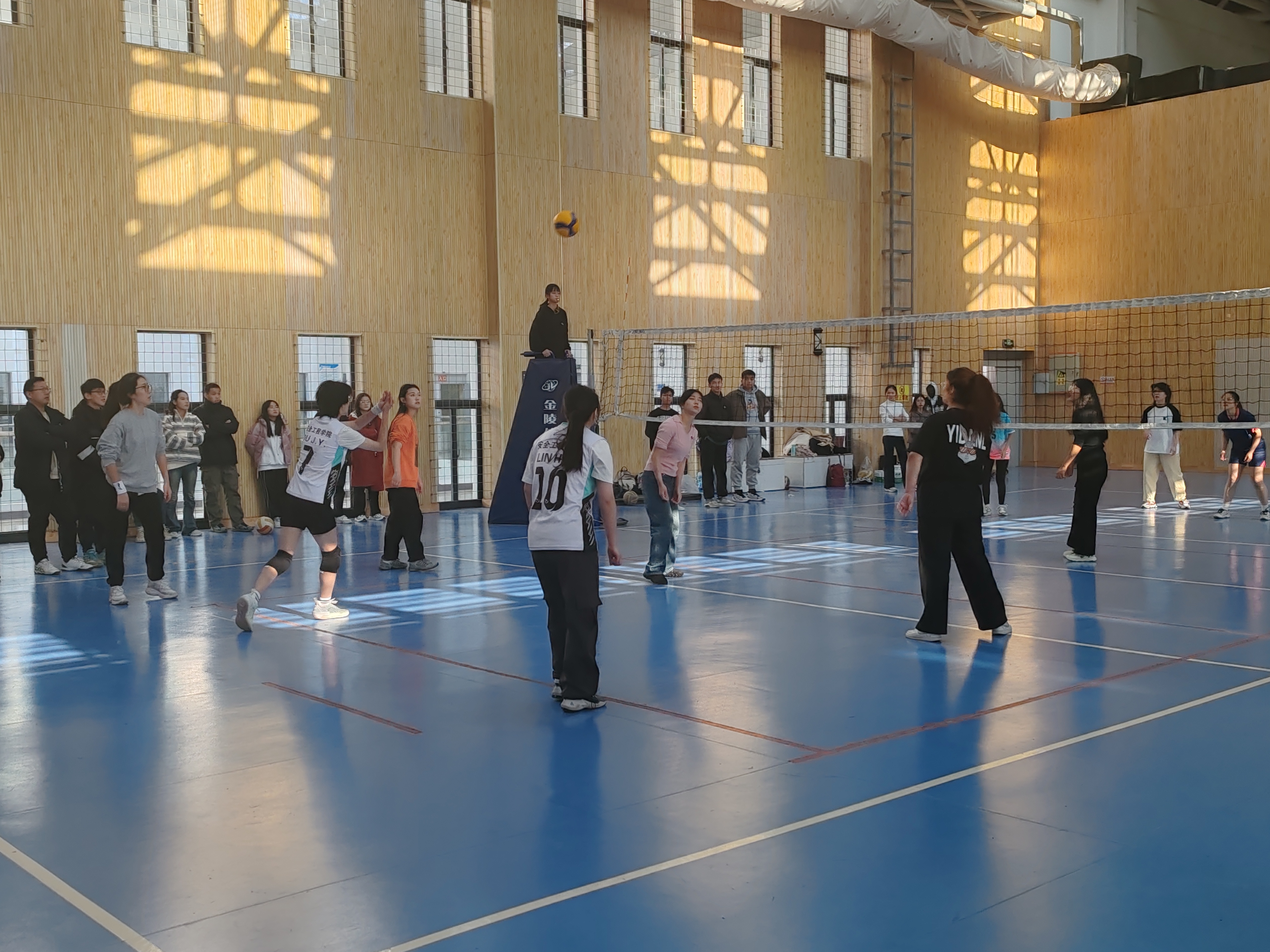 女排的精彩配合既展现了团队凝聚力,又发扬了运动健儿的拼搏奋斗精神,展现了安全学子的竞技风采。