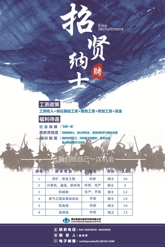 为适应煤炭行业的发展和自身业务范围不断扩大的需要,沈阳研究院拟吸引一批致力于煤矿安全技术研究工作的高校学子和科技工作者加盟研究院的科技队伍,组建稳固的以老带新、薪火相传的科研团队。