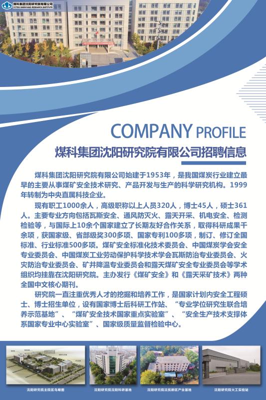 煤科集团沈阳研究院有限公司始建于1953年,是我国煤炭行业成立最早的主要从事煤矿安全技术研究、产品开发与咨询服务的科学研究机构,1999年转制为中央直属科技企业。主要专业方向涵盖瓦斯防治、通风防灭火、露天开采、机电安全、检测检验等领域,取得千余项科研成果,获300多项国家、省部级奖励,授权200多项国内外专利,制修订500多项国家及行业标准,主办发行《煤矿安全》和《露天开采技术》两种全国中文核心期刊。
