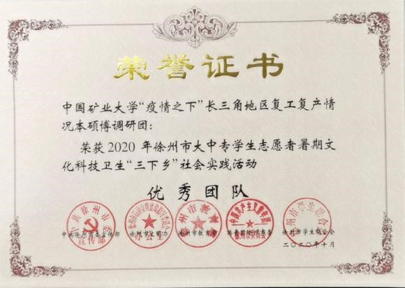 2020年担任校级重点实践团队(“疫情之下”长三角地区复工复产情况本硕博调研团)第一负责人,获得徐州市社会实践先进个人荣誉,团队荣获徐州市社会实践优秀团队称号。