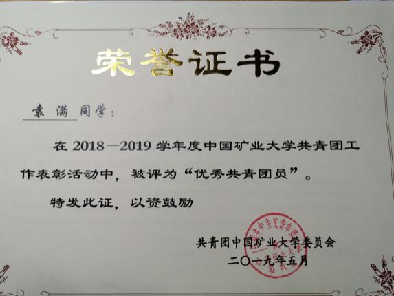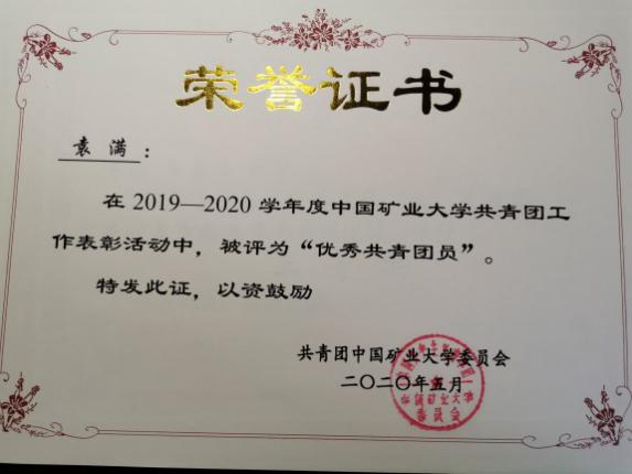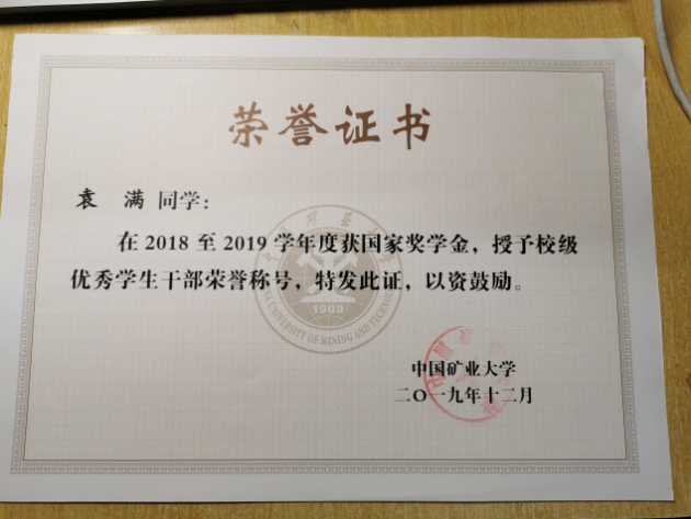 主要荣誉:曾获2018-2019学年国家奖学金、2019-2020学年国家奖学金、2019年中瑞恒优才奖学金。连续两年获中国矿业大学优秀共青团员、中国矿业大学优秀学生干部称号。获徐州市救助管理站优秀志愿者、2019年校级社会实践先进个人、校级优秀社会实践团队负责人;2020 年徐州市社会实践先进个人、徐州市优秀社会实践团队负责人、中国矿业大学服务标兵、中国矿业大学110周年校庆文艺演出先进个人、中国矿业大学基础课“学习之星”等荣誉