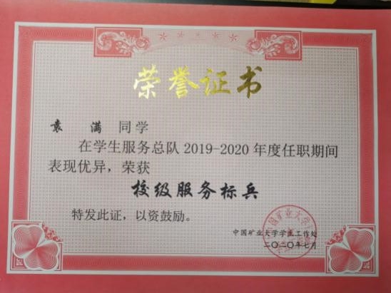 团委学生会主席、第十四届学生代表大会执行委员会主任。我勤于学业,大二综合素质测评成绩为2/137,连续两年获得国家奖学金,获得2019中瑞恒优才奖学金,高等数学A2满分获得中国矿业大学基础课学习之星称号,高分通过英语四六级、计算机二级考试。在大学生涯中,我连续两年取得中国矿业大学优秀学生干部、中国矿业大学优秀共青团员称号;获得徐州市救助管理站优秀志愿者、徐州市社会实践先进个人等荣誉,两年来我共获得校市级及以上荣誉40余项,志愿服务时长91小时。同时我专注科研创新,主持参与国家级大学生创新创业计划两项,校“挑战杯”培育项目一项。实践出真知,我于大一大二暑假均带队参与“三下乡”社会实践活动,实践成果得到行业专家与调研单位的高度认可,两次调研均被评为校市级社会实践优秀团队。