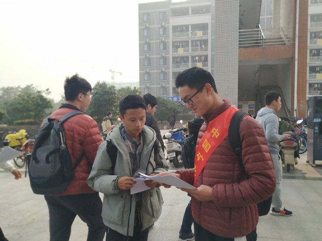 服务分队,各服务分队汇总后将纸质档交至学生服务总队办公室,并将将电子档发送至第九届“爱心班级”公邮。尽管正值中午吃饭的时间,但志愿者们毫不在意。他们忍受着饥饿,在寒风中拿着传单,一遍又一遍耐心地向路过的同学宣传活动的内容,以求更多人可以了解并参加到这个活动中来。从人来人往的高峰期一直到所有人吃完离去,志愿者们一直面带微笑,尽职尽责。