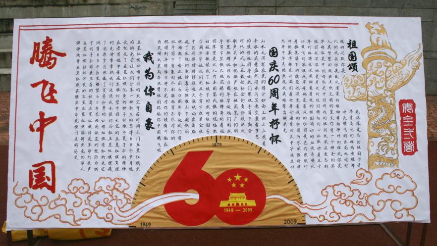 新澳门六合彩预测 本期军训板报以“腾飞中国”为主题,采用时间刻度盘来表现共和国光辉六十年,板报下方以祥云托起华表和板报主题来表达安全学子希望祖国蒸蒸日上的美好祝福。板报整体选用红色和金色,版面整洁大方,设计新颖,给人以焕然一新的感觉。