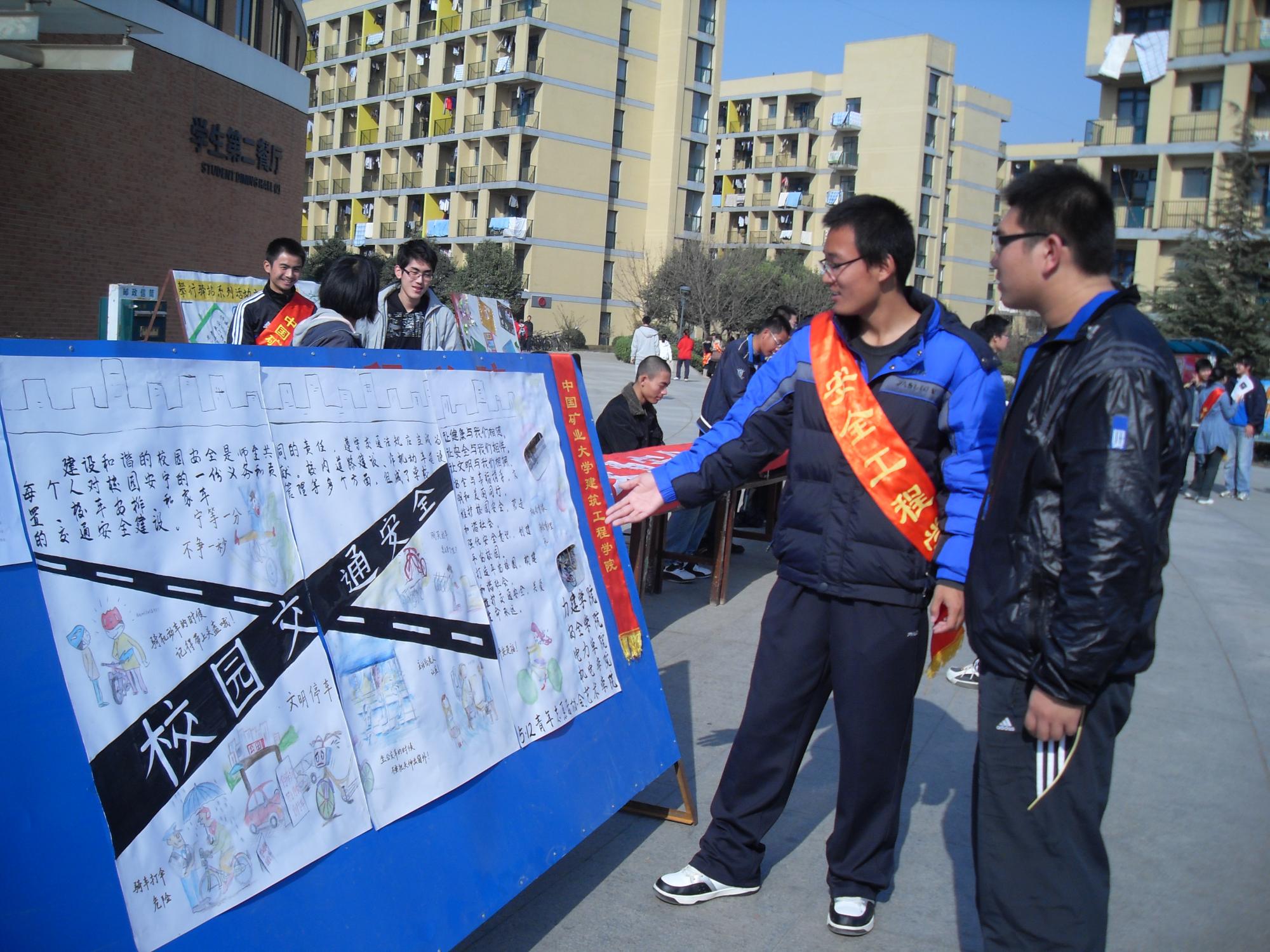 活动的开始,志愿者们将精心制作的宣传安全知识的宣传板置于二食堂广场,借此来提醒大家平时应多注意安全问题。 其中包括驾驶机动车、骑自行车、乘坐公共汽车以及在校园中停放自行车时等应注意的事项,形式活泼的的宣传板报吸引了很多路过的同学驻足观看。随后,志愿者们向路过的同学发放关于校园安全的传单并耐心地向他们介绍了校园安全对在校大学生的重要性,部分负责宣传的志愿者还告诉了同学们解决平时生活中的常见的一些安全隐患的方法。同学们也纷纷表示会更加注意校园的安全问题。志愿者们还邀请参加本次活动的同学们在活动的宣传条幅上签下自己的名字,从而来坚定自己以后要时刻注意安全问题的决心。