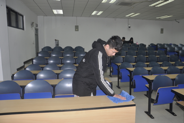 志愿者们积极迅速地投入到清理中去,用携带的盆、桶和抹布等工具对课桌上的涂抹等痕迹进行了擦拭,难以清理的地方就用指甲努力清理。在清理课桌的过程中,志愿者们始终保持安静,没有对自习的同学造成影响。虽然任务量很大,但是志愿者们服务热情高涨,在志愿者们的努力下,两个区域的教室课桌很快焕然一新。下午四点,活动顺利结束。