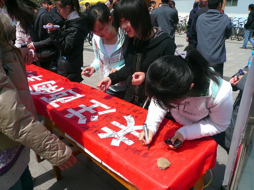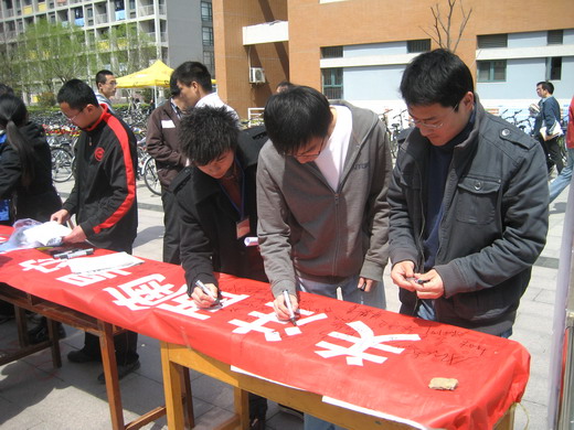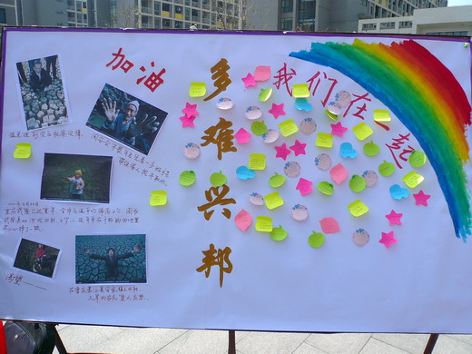 参加活动的同学通过在“关注西南旱灾,彰显社会责任”的横幅上签名表示对西南旱情关注,或者用小纸条在设有“我们在一起多难兴邦”的宣传板上写下自己对灾区人民的真挚祝福。