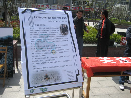 的党员工作站联合承办的“关注西南旱灾”专题宣传活动既为灾区人员祈福活动在三食堂广场举行。