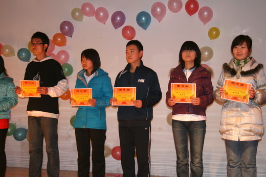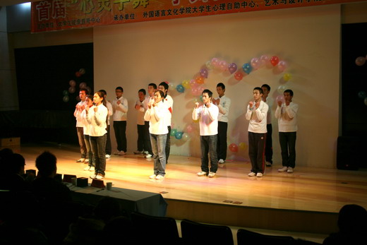 组队也进行了精彩演出。安全09-2班方队作为最后一支上场的参赛队伍,为大家献上了一场压轴大戏。《怒放的生命》乐音响起,他们很快将自己融入其中,手随心而舞,达到乐音、肢体、心灵三者的完美结合,在音乐旋律的间歇处他们用手语告诉大家:让我们关爱聋哑人,让苍天知道他们永不认输,他们是最棒的。他们投入的表演赢得了在场观众热烈的掌声。比赛期间,我校09级“新声畅想”十佳选手任文笔同学为大家献上一首《手心的太阳》,为大家在寒冷的冬日送来丝丝温暖。