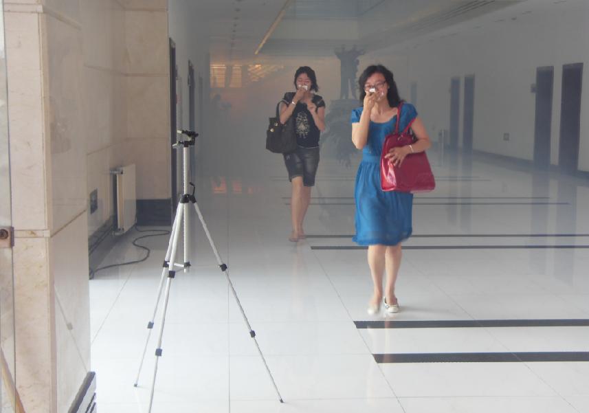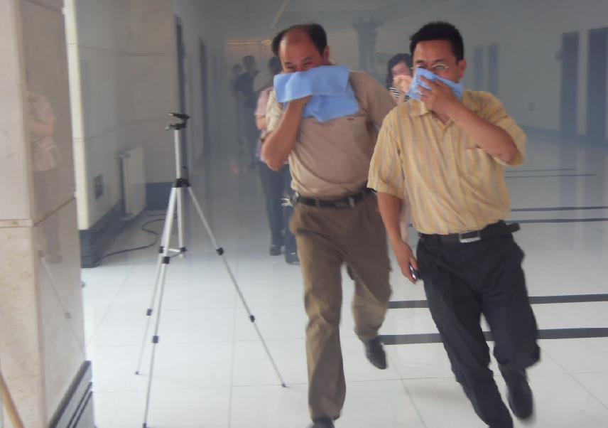 演习开始,整个行政大楼,烟雾弥漫,防火报警笛鸣响。所有火场的工作人员用湿毛巾捂住口鼻,井然有序地沿消防楼道逃生。整个演习进行了大约20分钟,所有人员都顺利抵达安全地点。