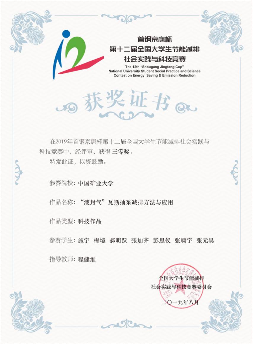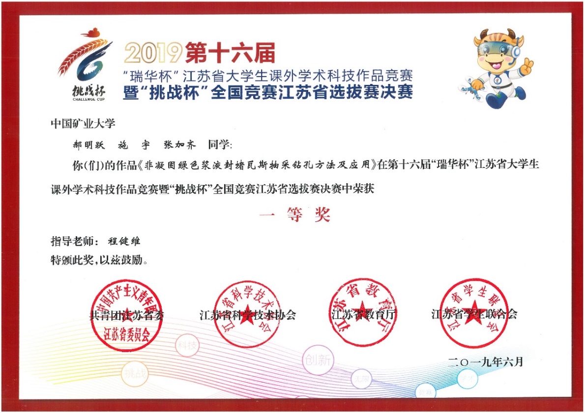 学习期间,他为了提高自己专业知识应用实践能力,积极参与多项大学生创新创业实践竞赛,在竞赛中一次次锻炼自己的综合能力。在他与指导老师的共同努力下,荣获2019年第五届全国高校安全科学与工程大学生实践与创新作品大赛国赛一等奖,2019年第十六届“挑战杯”全国大学生课外学术科技作品竞赛国赛二等奖、省赛一等奖,2019年第十二届大学生节能减排社会实践与科技竞赛国赛三等奖,2019年第五届中国“互联网+”大学生创新创业大赛江苏省赛二、三等奖各一项,2019年第五届全国大学生能源经济学术创意大赛国赛三等奖,2019年第三届中国矿业大学国防知识竞赛一等奖,参与创新创业活动期间,共计获得国家级竞赛奖项4项,省级竞赛奖项3项。并以第一、二作者发表核心论文3篇,第二作者身份申请发明专利2项。