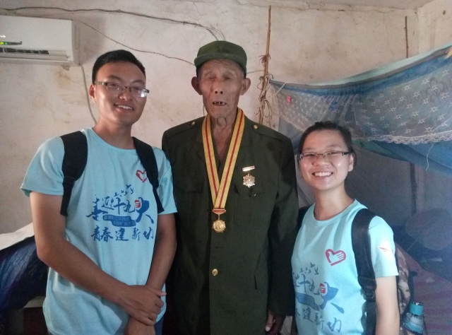 黄兴位老前辈于1944年入伍,当时的他仅有15岁。回忆起当时入伍的情形,老前辈说道:“当时是我自己去入伍的,家庭太困难,没有吃,没有喝,贫困,家里一共有五口人。”入伍之后,黄老前辈在队伍里面是小兵,每天早上起来跑步,练习枪法,练习刺杀,四面转法等。黄老前辈至今印象最深刻的一次战役是涟水战斗,国民党74师搁后面撵,黄老前辈在警卫排带领担架队到前方接收伤兵。葛老前辈曾荣获两次奖章,分别是在淮海战役和渡江战役获得。回忆起淮海战役,他说:“淮海战役时我住在济南,那之后济南都解放过了,那时候在山东打孟良崮74师,我都参加了,那时候我带领担架队上去抢受伤兵的,那时候打孟良崮,74师师长张灵甫,被围着,也没法吃,也没法逃,南京飞机送来的牛奶面包,它不敢飞矮,飞矮我们用高氏机枪、高氏炮,就给它打下来了。”现在老前辈也会每年去邱集的纪念塔去纪念当年牺牲的战友们,现在每年的九月三十号都会在那里开纪念会。活动最后,老前辈和志愿者们亲切合影留念。