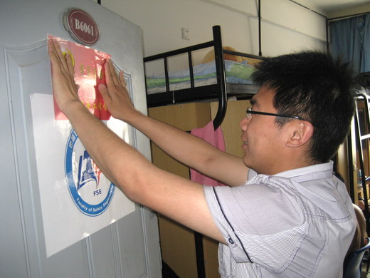 短暂的会议过后,学生党员所在的宿舍门上都在各班党员的工作下挂上了“学生党员宿舍”的牌子。此次的党员宿舍名牌由红底黄字构成,与国旗的色彩一致,牌的最左上角印有“镰刀和锤头”代表中国共产党。这块牌子可以时刻提醒广大学生党员以身作则,积极引导其他同学学习科学发展观,在学习中不断创新实践,努力构建和谐宿舍。