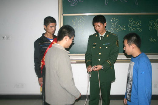 青协邀请到的消防战士在热烈的掌声中走进教室,讲座正式开始。讲座的开始,消防战士以俄罗斯和莫斯科友谊大学的宿舍火灾事故为例,给同学们敲响了警钟。随后消防战士又讲述了白天鹅酒店火灾,借此说明国人防火意识的严重缺乏。紧接着,消防战士又介绍了宿舍、教室、礼堂、车站、商场等地的火灾防范和消防须知。在讲座中,消防战士们还现场演示了火灾逃生时双平结和结结的两种打绳结方法,并邀请了一名青年志愿者以及其他两名新生上台表演,亲自授予他们打绳结的方法。