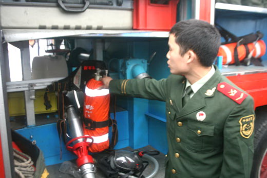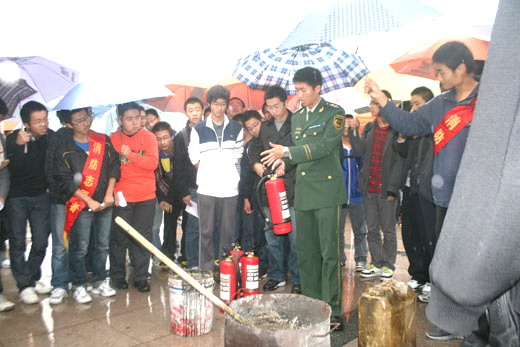 青协志愿者的带领下,新生们到二食堂广场参观了消防器材。参观的同时,消防战士们在一旁为同学们一一讲解。在消防战士们的指导下,新生们成功地掌握了干粉灭火器的使用。现场同学表现活跃,不断有人上台表演,整个灭火演练过程井然有序地进行。