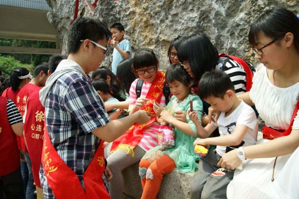 17日上午10点,志愿者们来到启聪聋儿学校,给孩子们带去了文具,玩具以及一些食物。随后带领孩子们到淮海战役纪念塔参观。