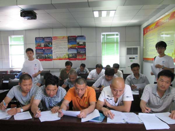 因和矿工时间冲突及调研队不便下井等问题,调研活动只得安排在矿工会议室分批次完成。即便烈日炎炎,队员们依旧热情如火。1点50分,调研队来到窗明几净的矿工会议室,瞬间眼前一亮,印象中黑黢黢的矿工们衣着整洁,脸上露出和蔼的笑容,一改队员们平日对矿工的认识。随即,队员们一边向矿工介绍此行的目的一边分发问卷。矿工们很友善,积极配合团队的调查。队员们也认真的向他们解释不明白的地方,丝毫不敢懈怠。在闲聊中,团队了解到矿工们现在干劲十足,不怕工作环境的脏乱差,努力认真的把煤炭行业最基础的工作做好。其中,徐州市劳动模范赵伟说:“我在张集矿工作十多年了,把这里当作自己的家。安全问题是重点问题,是一切之本。只要团队兢兢业业,脚踏实地的把工作做好,具有较强的安全意识,团队就一定会不断前进,创造奇迹!”