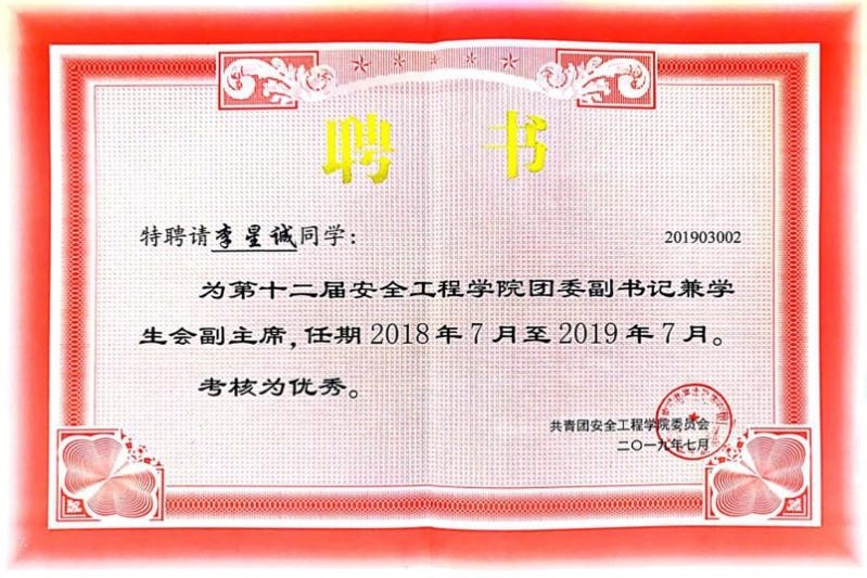 安全工程专业2017-1国际班本科生。大学三年加权成绩排名安全专业第一(1/146),曾获校优秀学生干部、校优秀学生、校优秀共青团干部等荣誉称号。曾获2017-2018学年国家奖学金、2018-2019学年国家奖学金、2019-2020校一等奖学金、2018年第五届“瓦斯-好学”奖学金、2019大屯企业奖学金等。现推免至北京大学直博攻读流体力学博士学位。