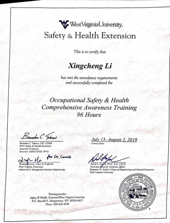 依托安全学科双一流建设平台,曾同国际班一齐赴美国西弗吉尼亚大学(WestVirginia University)、3M(中国)研发总部等地学习与实习,并取得实训证书。