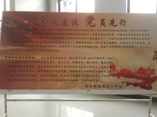 11月27日党员工作站积极与团委学生会合办学风建设论坛,通过同学们的自由交流发现大家在学习中普遍存在的问题,并探讨学习经验。12月1日党员工作站在梅三一楼大厅展出以“学风建设,党员先行”为主题的展板,展板围绕怎样加强党员工作站、保持学生党员先进性这一问题,展出期间宣传板成为了同学们了解党员工作站,关注党员在学习上发挥模范作用的一个有效窗口。12月3日,为提醒同学们积极备考英语四六级考试,党员工作站与团委学生会于梅三一楼大厅及桃一五楼宣传栏建立了英语四六级考试倒计时工作牌,倒计时工作牌的建立,体现了新澳门六合彩预测