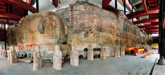 下午三点,团队成员来到马龙山卧佛镇参观我国最大的卧佛。团队成员从马龙山下眺望山顶看到了新修的大殿,询问附近的村民后得知,马龙山卧佛长年散落于乡间,遮蔽卧佛的大殿早毁于十年浩劫。据网上的图片显示,数年前这里都还暴露荒野,但近年来为了更好的保护地区佛教文化,摩崖石刻已加盖大殿予以保护。随后,团队成员来到殿前参观,殿外的彩塑较为粗鄙,部分彩塑外皮甚至将近脱落。进入内殿,一尊大佛卧与正中。卧佛长36米,头东脚西,背南面北,侧身而卧,左手臂直伸至胯,头饰螺髻,双目微闭,神态安详。卧佛的上方刻有一群天女浮雕像,身前则是“九曲天河”及十弟子虔诚跪拜的石像;佛首下方还有“九龙浴太子”造像,首、膝处各站立一个8米高的护法神像。