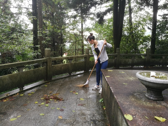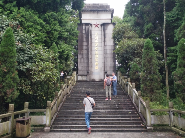 上午九时许,团员们来到井冈山革命先烈纪念塔,井冈山革命先烈纪念塔位于井冈山茨坪街道办事处的旁边,占地近十亩,同井冈山先烈纪念塔和红军烈士墓组成。塔底为5.5米X5.5米的正方形,塔高11米,塔的四面均镶刻有原遂川中学王教导员手书的凹形井冈山革命先烈纪念塔十个大字。整座塔基占地103平方米,塔前与红军烈士墓相连,铺有水泥地面和水泥台阶,四周松柏常青、庄严肃穆,从五十年代开始,这座塔就成了向国内外宣传井冈山的主要形象标志。烈士墓主要是为纪念在保卫井冈山革命根据地和反会剿斗争中英勇牺牲的红军而建。墓内集中合葬有1929年散葬于茨坪周边的红军战士遗骨。井冈山革命先烈纪念塔经过整合已成为井冈山红色旅游景点,是进行革命传统教育和爱国主义教育的基地。团员们面对先烈纪念塔肃立敬礼,向革命烈士致哀并三鞠躬。看到纪念塔周围落叶遍地,团员们不由自主地拿起清洁工具清扫起来,中午十二点,团员们结束活动。