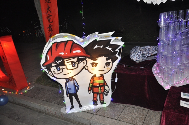 的吉祥物——全全和消消,象征着安全和消防两个专业。中间主体是以欧式建筑风格为灵感设计而成的错落有致的半心形,它与最右边的另一个半心形组合而成一个多角度完整的心形,象征着对新年的美好祝愿。左右两边挂上了充满年味的对联。最上方则是小彩灯与小卡片组成的新年愿望墙,过往的行人们纷纷在上面写下新一年的美好愿望。多彩的花灯既是对过去的传承又寄寓着大家对未来的祝福。