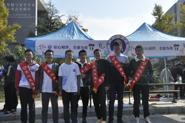 辅导员刘世通、体育部成员和志愿者们在矿科附近搭建服务站。比赛中,志愿者们不仅为运动员们提供饮用水、功能饮品等补给物品,而且在比赛过程中用击鼓呐喊的方式为运动员们加油助威。一次次擂鼓呐喊不仅展现了志愿者们的热情,还擂出了参赛选手的精气神。