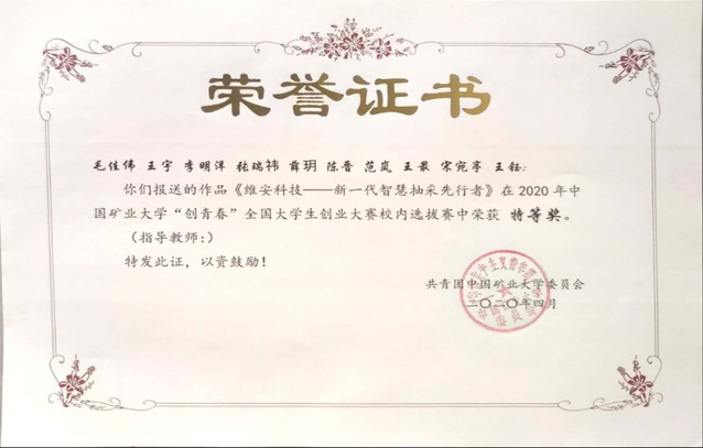 2019年参与了创青春创业计划赛获得了:中国矿业大学创青春校内校内选拔赛特等奖。