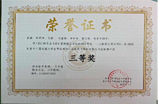 2019年参与全国大学生节能减排比赛获得了:校内选拔赛三等奖。