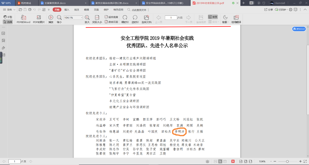 优秀学生干部等荣誉;两年来我共获得校级及以上奖项10多项,志愿服务时长90多小时。科研创新方面,我参与2020年创青春大学生创业计划赛,并取得了校内选拔赛特等奖的优异成绩,参与徐州市创新创业大赛,取得市级二等奖,现主持校级大创项目一项。此外,我积极参加社会实习,于2018年暑假前往中国科学技术大学进行主题为安全工程学科人才培养的交流学习、2019年暑假和组内成员合作进行了对长江三角洲疫情之后复工复产情况的社会实践调研。